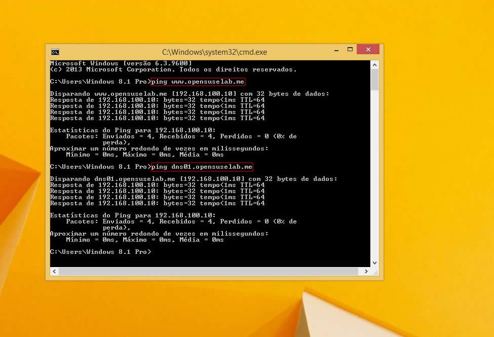 Disparando dns01.opensuselab.me [192.168.100.10] com 32 bytes de dados: