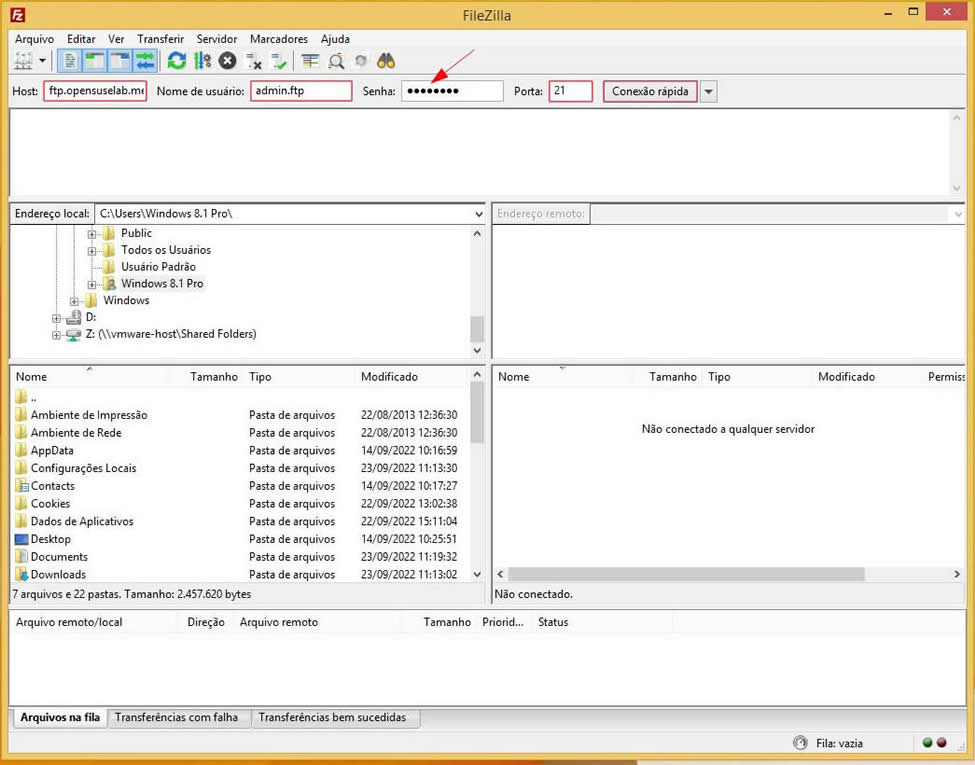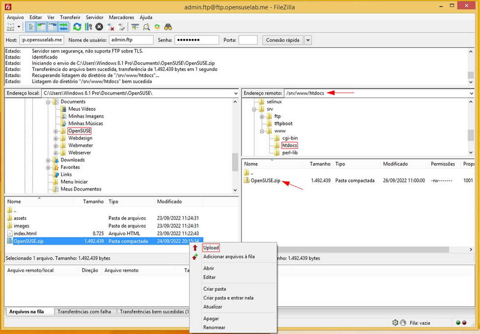 Na parte superior você encontra a barra de comandos, o lado direito é o lado do servidor com o qual o FTP está conectado. Ao lado esquerdo é possível ver os arquivos e diretórios de seu website, também outros programas em seu computador. Na parte inferior exibe o processo de envio de arquivos para o servidor. Para copiar algum arquivo, basta localizá-lo em seu computador na parte esquerda do programa e jogá-lo para a parte direita em seu servidor. Entretanto antes de usar o FTP, você deve saber como é feita a estruturação dos arquivos e diretórios de sua homepage ou CMS.